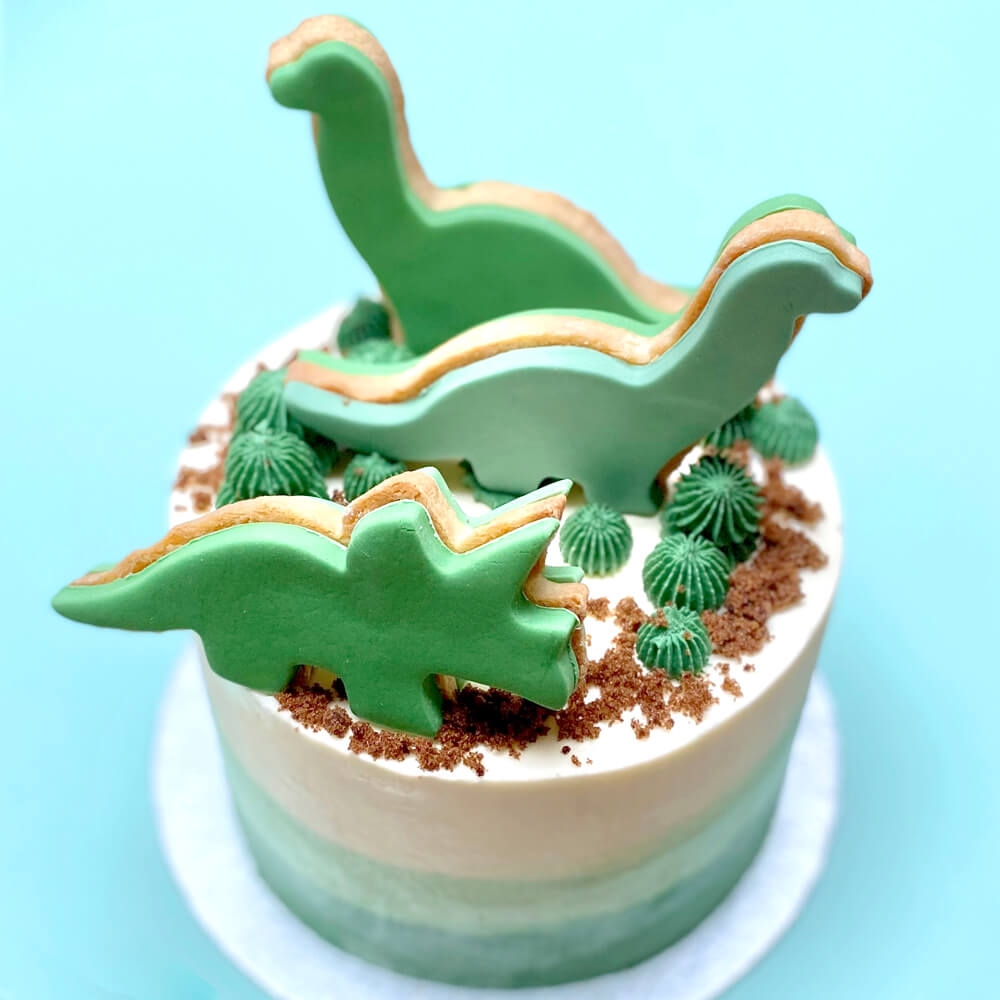 Triple sponge layers filled with chocolate buttercream covered with green ombre buttercream, topped with iced sugar cookie dinosaur biscuits.