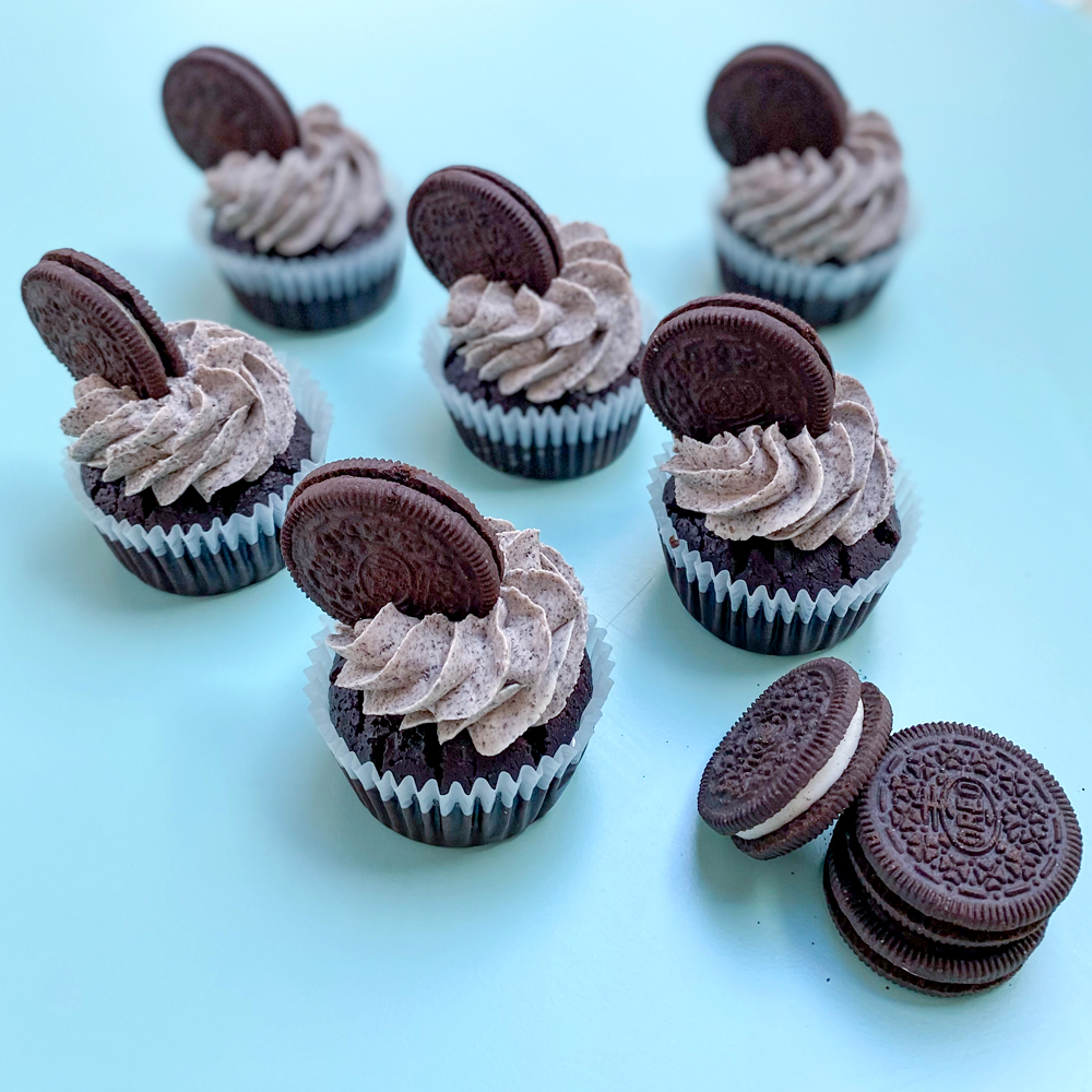 Chocolate sponge flavour cupcakes finished with Oreo buttercream and topped with an Oreo biscuits.